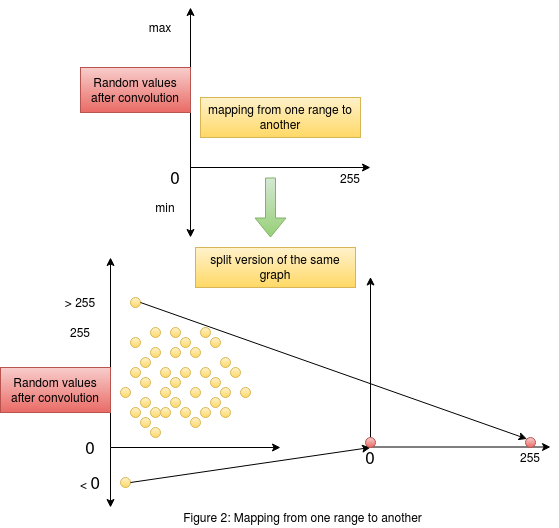 The mapping process simply maps the highest value in the random set of convolved output to the maximum of the required range (255) and similarly maps the