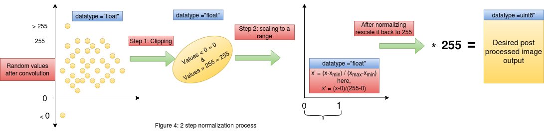 After the first step we now have a set of convolved outputs in the range [0,255]. In the next step of normalization , we will perform scaling to the range [0,1]. This kind of scaling to [0,1] from a higher range of [0,255] will help map large values into a constrained space , thus helping us preserve the values. This step of scaling down could be skipped in certain cases , but it is highly recommended to practice this in all problems as this ensures the intactness of the information/change in pixel intensities when we scale back the values from [0,1] to [0,255] by mutiplying by 255. This can be further supported by the way in which images are handled in python. Any operation on an image array will convert that corresponding output into floating point in python. Thus when we scale down from [0,255] to [0,1] , the operation is happening on floating point numbers (This preserves the information due to floating point accuracy). Now when we rescale it back to the range of [0,255] by multiplying it by 255 and then converting it to "uint8" format , which is the format in which the image is represented , we would have preserved the changes in the "uint8" format.